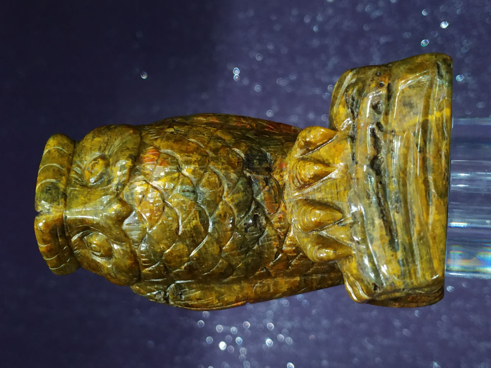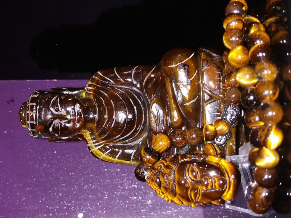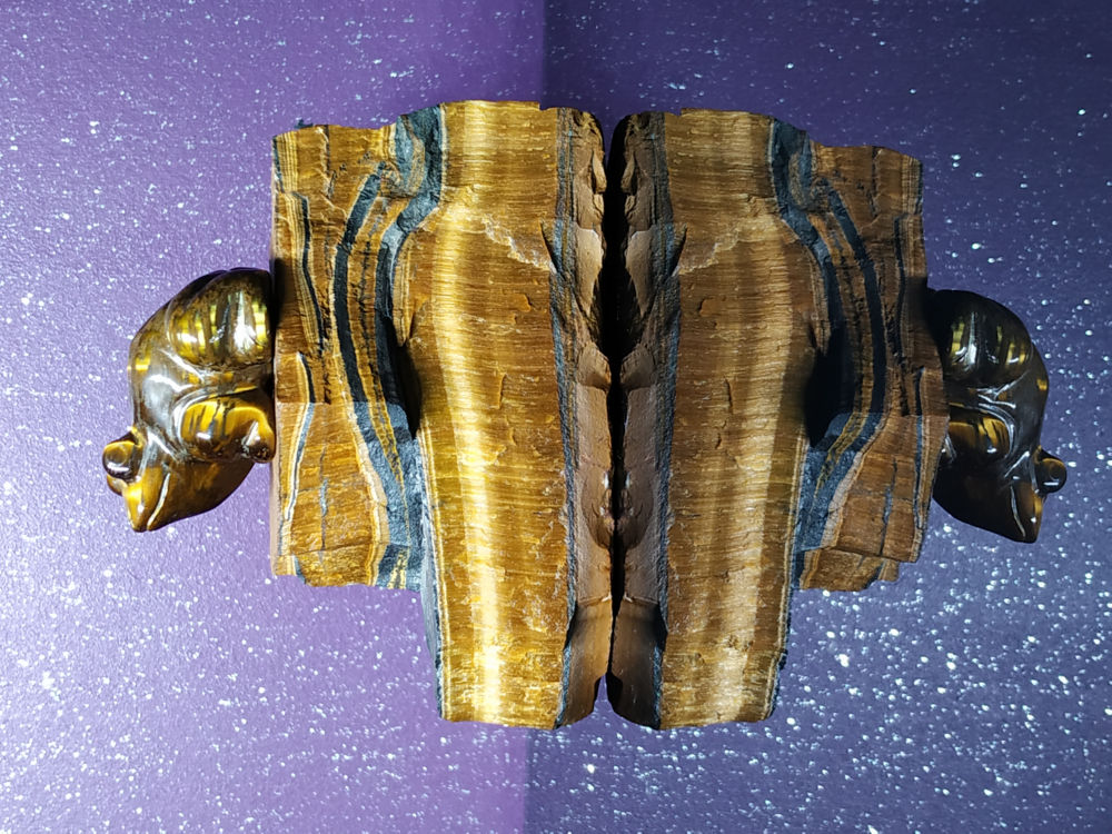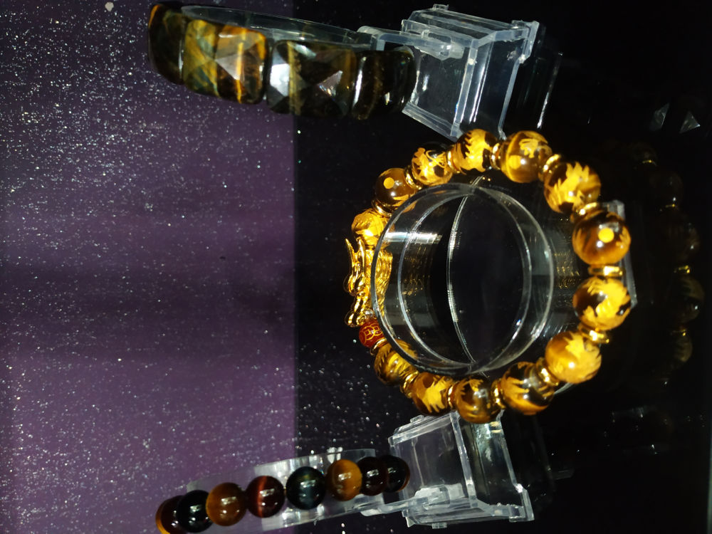 Oeil de tigre bracelet symboles gravées et tête de dragon feuille d'or