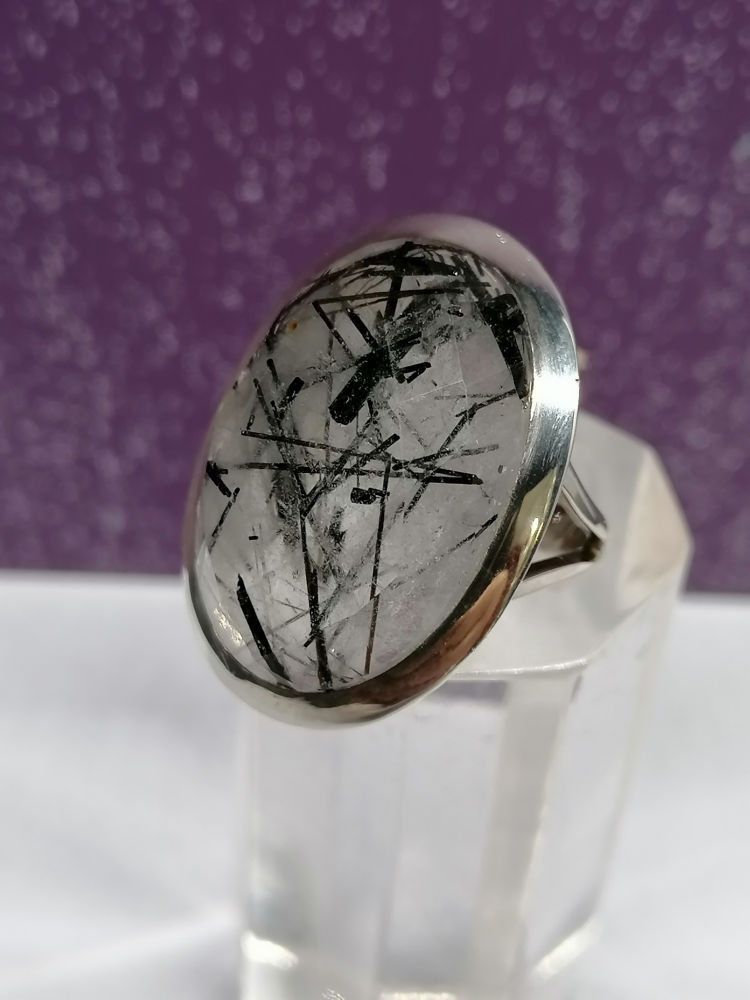 Quartz blanc inclusions tourmaline noire bague cerclée argent 9.125