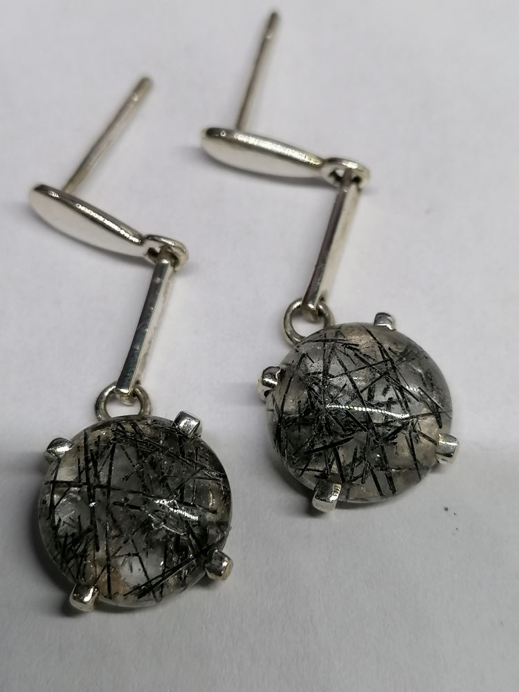 Quartz blanc inclusions tourmaline noire boucles oreilles serti argent 9.125